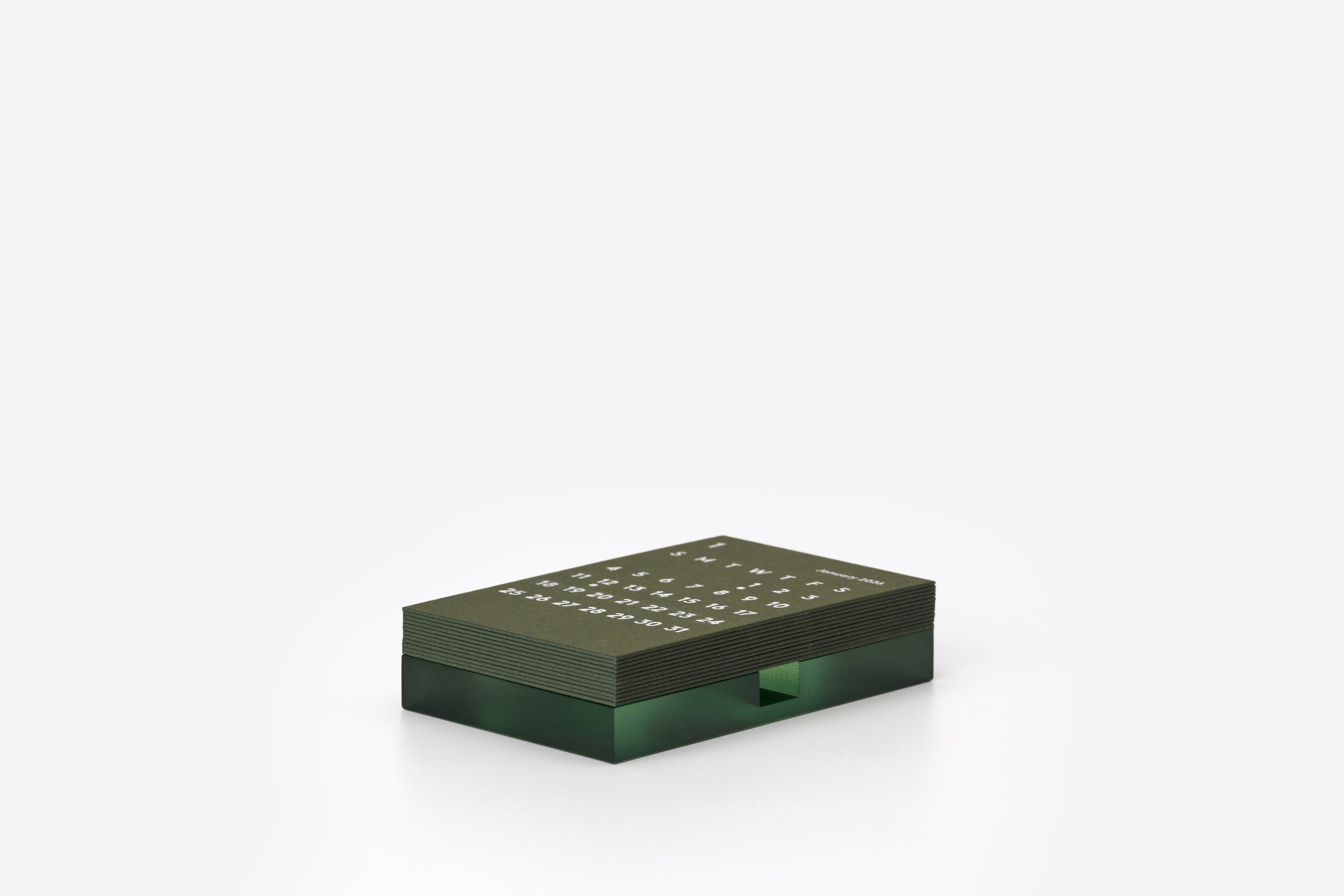 小さくて潔いシルエットの卓上カレンダー CLARA(クララ)。優しい風合いの厚紙に大人しやかに輝く箔文字と、ひとつひとつ丁寧に染色されたアクリルの台座は、側面にブラスト加工が施され、光の当たり方によって表情が変わります。